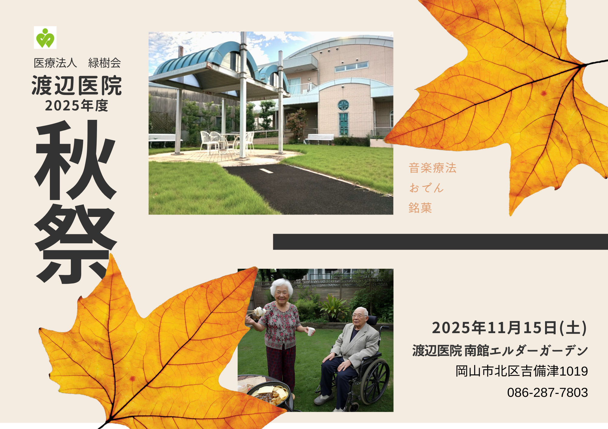 秋祭を開催します。日時:2025年11月15日(土)場所:渡辺医院 南館エルダーガーデン 内容:音楽療法、おでん、銘菓